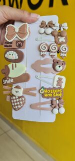 A set of adorable brown and beige hair clips, featuring a mix of bows, teddy bears, and playful dessert-themed designs. Here are the key elements: