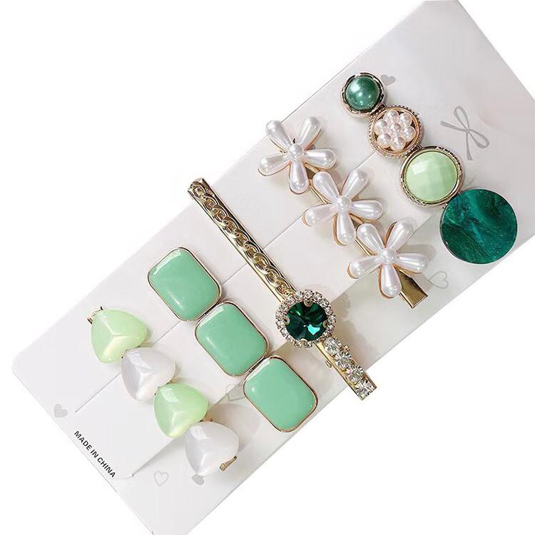 Stunning green-themed hair clip set featuring a mix of pearls, gemstones, and floral elements. The color palette blends soft mint and deep emerald green with gold accents, creating a fresh and elegant look.