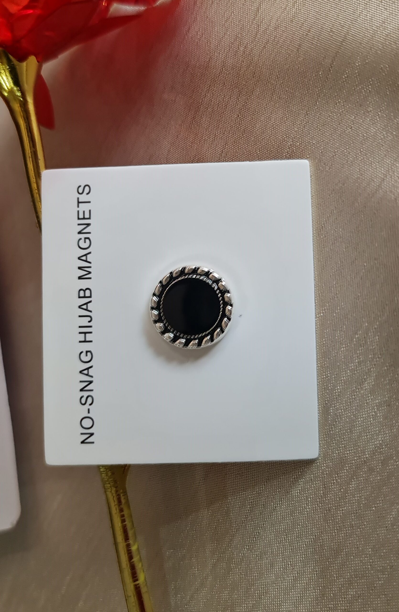 premium hijab magnets designed to secure your hijab effortlessly without causing fabric damage. Featuring a sleek black stone center encased in an elegant antique silver-toned frame with detailed edging, these magnets combine both functionality and style.