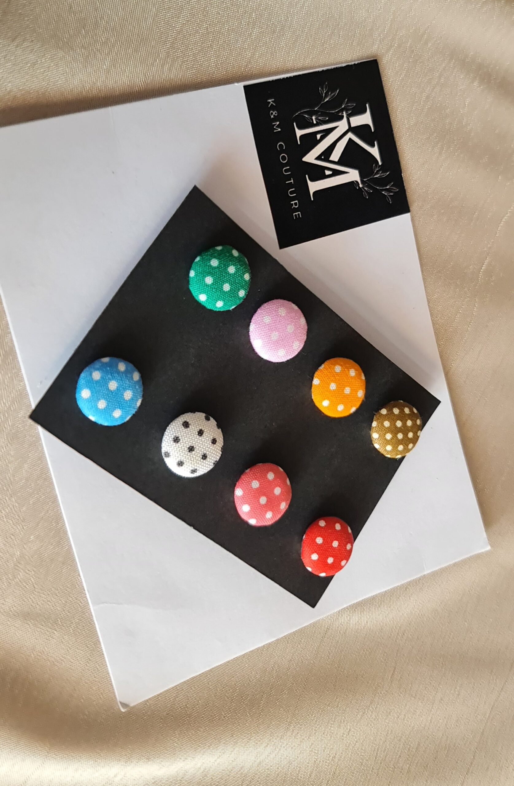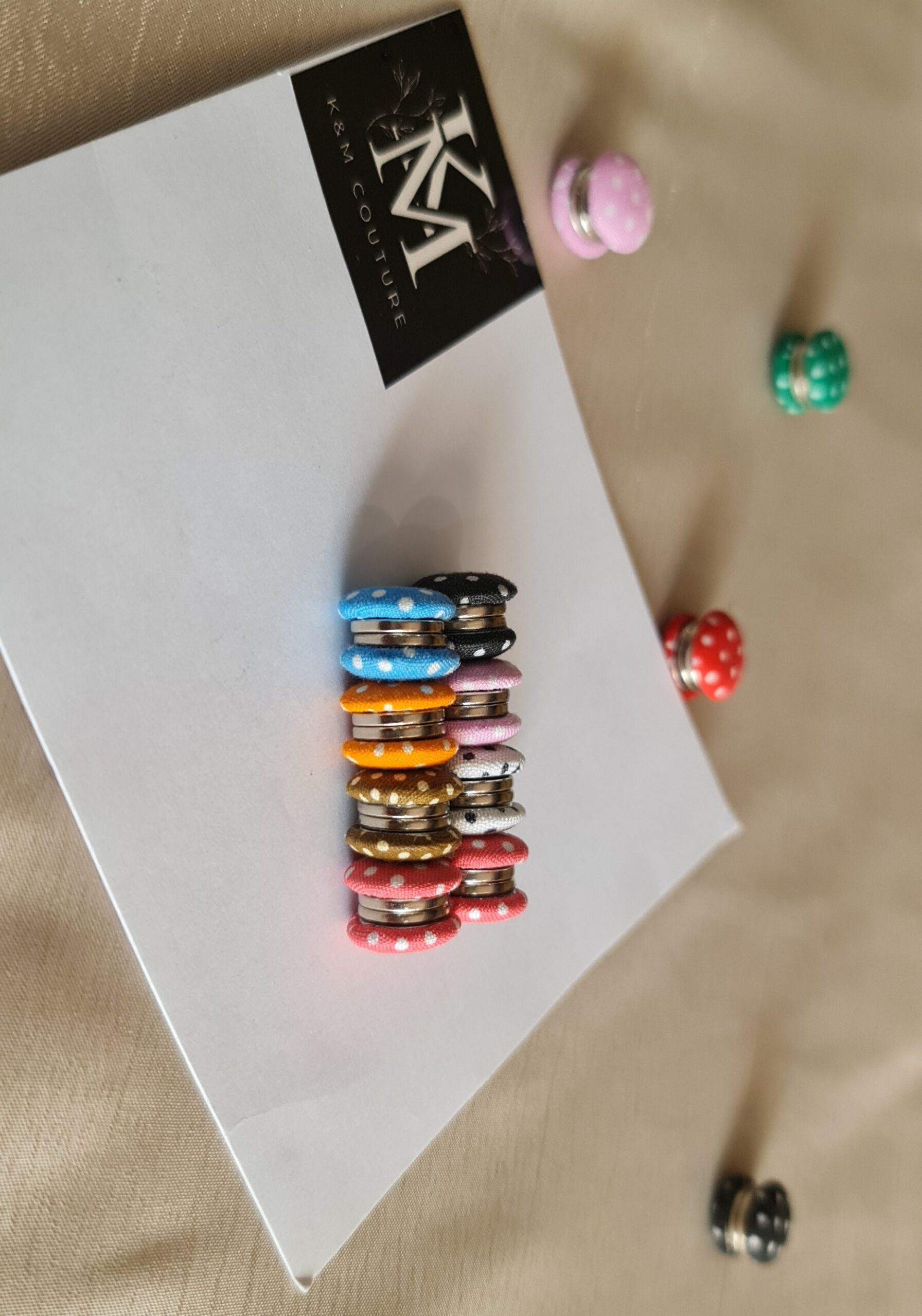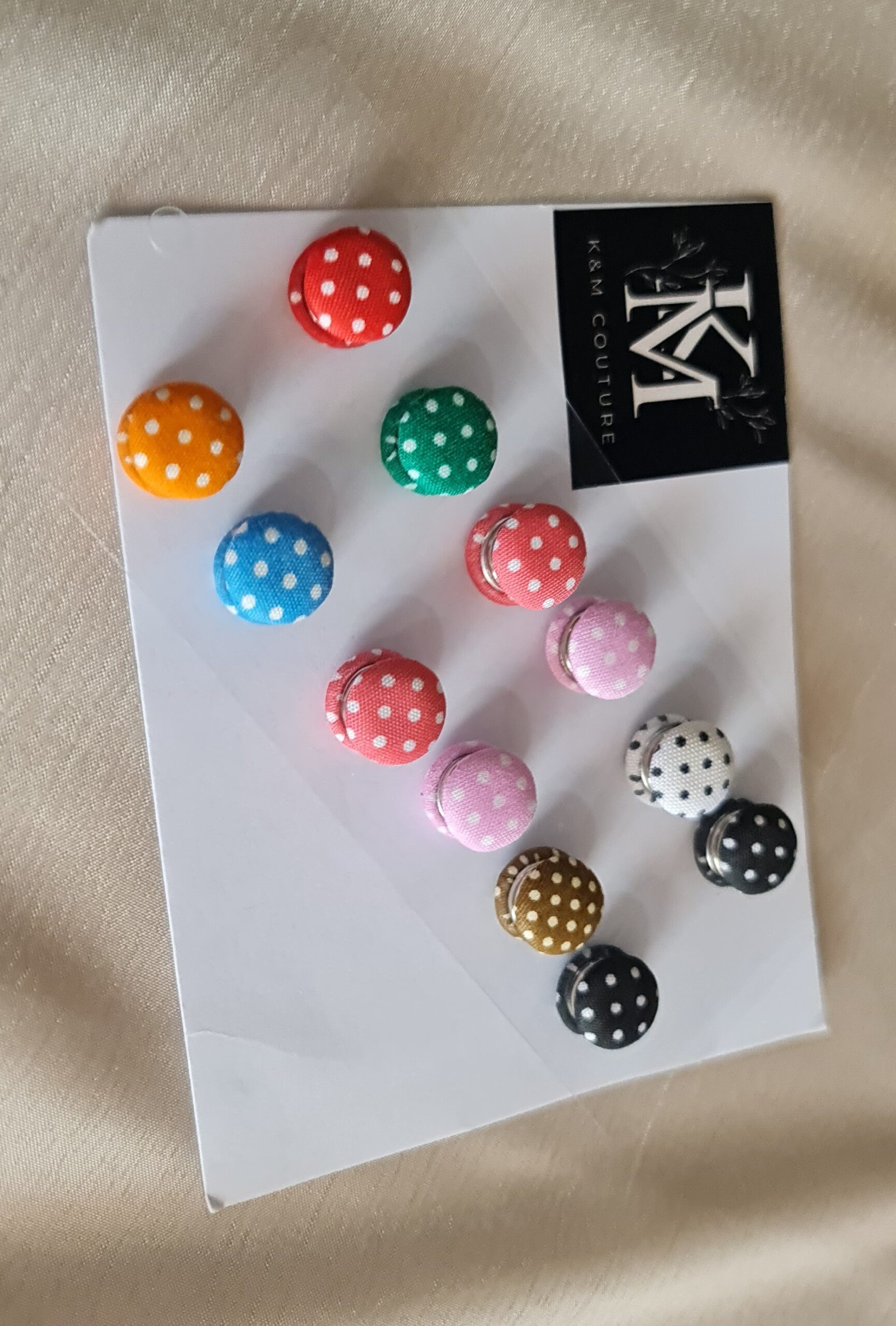 Colorful polka dot fabric hijab magnets, designed to add a playful and stylish touch while keeping your hijab securely in place. Each magnet is covered with soft fabric in vibrant colors like red, pink, green, blue, orange, brown, black, and white, all with classic white polka dots.